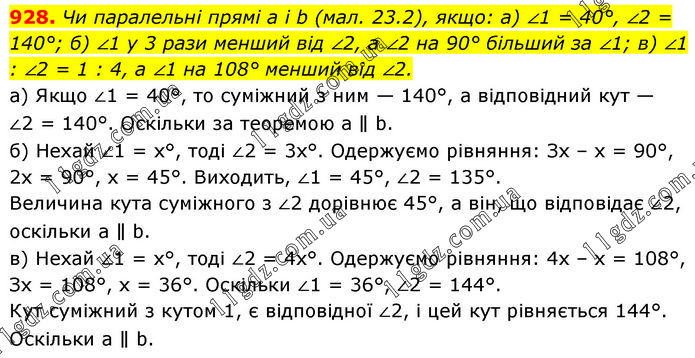 Чи паралельні прямі a і b (мал. 23.2), якщо: а) ∠1 = 40°, ∠2 = 140°; б) ∠1 у 3 рази менший від ∠2, а ∠2 на 90° більший за ∠1; в) ∠1 : ∠2 = 1 : 4, а ∠1 на 108° менший від ∠2. а) Якщо ∠1 = 40°, то суміжний з ним — 140°, а відповідний кут — ∠2 = 140°. Оскільки за теоремою а ∥ b. б) Нехай ∠1 = х°, тоді ∠2 = 3x°. Одержуємо рівняння: Зх – х = 90°, 2х = 90°, х = 45°. Виходить, ∠1 = 45°, ∠2 = 135°. Величина кута суміжного з ∠2 дорівнює 45°, а він, що відповідає ∠2, оскільки а ∥ b. в) Нехай ∠1 = х°, тоді ∠2 = 4x°. Одержуємо рівняння: 4х – х = 108°, Зх = 108°, х = 36°. Оскільки ∠1 = 36°, ∠2 = 144°. Кут суміжний з кутом 1, є відповідної ∠2, і цей кут рівняється 144°. Оскільки а ∥ b.