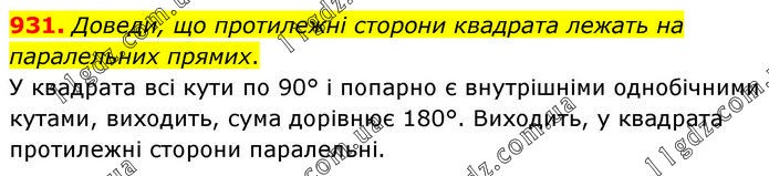 Доведи, що протилежні сторони квадрата лежать на паралельних прямих. У квадрата всі кути по 90° і попарно є внутрішніми однобічними кутами, виходить, сума дорівнює 180°. Виходить, у квадрата протилежні сторони паралельні.