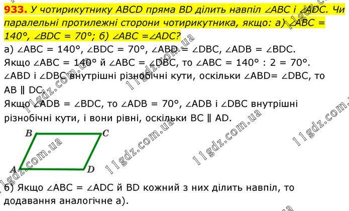 У чотирикутнику ABCD пряма BD ділить навпіл ∠ABC і ∠ADC. Чи паралельні протилежні сторони чотирикутника, якщо: а) ∠ABC = 140°, ∠BDC = 70°; б) ∠ABC =∠ADC? a) ∠ABC = 140°, ∠BDC = 70°, ∠ABD = ∠DBC, ∠ADB = ∠BDC. Якщо ∠ABC = 140° й ∠ABC = ∠DBC, то ∠ABC = 140° : 2 = 70°. ∠ABD і ∠DBC внутрішні різнобічні кути, оскільки ∠ABD= ∠DBC, то AB ∥ DC. Якщо ∠ADB = ∠BDC, то ∠ADB = 70°, ∠ADB і ∠DBC внутрішні різнобічні кути, і вони рівні, оскільки BC ∥ AD. б) Якщо ∠ABC = ∠ADC й BD кожний з них ділить навпіл, то додавання аналогічне а).