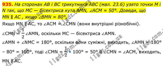 На сторонах AB і BC трикутника ABC (мал. 23.6) узято точки M і N так, що MC — бісектриса кута AMN, ∠ACM = 50°. Доведи, що MN ∥ AC , якщо ∠BMN = 80°. Якщо MN ∥ AC, то ∠ACM = ∠CMN (вони внутрішні різнобічні). ∠CMN = 1/2∠AMN, оскільки MC — бісектриса ∠AMN. ∠AMN + ∠NMC = 180°, оскільки вони суміжні, виходить, ∠AMN = 180° – 80° = 100°, тоді ∠CMN = 1/2 • 100° = 50° й ∠CMN = ∠ACM, виходить, MN ∥ AC.