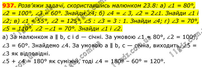 Розв’яжи задачі, скориставшись малюнком 23.8: а) ∠1 = 80°, ∠2 = 100°, ∠3 = 60°. Знайди ∠4; б) ∠4 = ∠ 3, ∠2 = 2∠1. Знайди ∠1 і ∠2; в) ∠1 = 55°, ∠2 = 125°, ∠5 : ∠3 = 3 : 1. Знайди ∠4; г) ∠3 = 70°, ∠5 = 110°, ∠2 −∠1 = 70°. Знайди ∠1 і ∠2. а) За малюнком а ∥ b, с і d — січні. За умовою ∠1 = 80°, ∠2 = 100°, ∠3 = 60°. Знайдемо ∠4. За умовою а ∥ b, с — січна, виходить, ∠5 = ∠3 як відповідні. ∠5 + ∠4 = 180° як суміжні, тоді ∠4 = 180° – 60° = 120°.