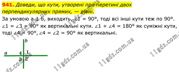 Доведи, що кути, утворені при перетині двох перпендикулярних прямих, — рівні. За умовою a ⊥ b, виходить, ∠1 = 90°, тоді всі інші кути теж по 90°. ∠1 = ∠3 = 90° як вертикальні кути. ∠1 + ∠4 = 180° як суміжні кути, тоді ∠4 = 90°, ∠4 = ∠2 = 90° як вертикальні.