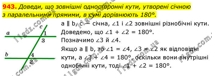 Доведи, що зовнішні односторонні кути, утворені січною з паралельними прямими, в сумі дорівнюють 180°. а ∥ b, с — січна, ∠1 і ∠2 зовнішні різнобічні кути. Доведемо, що ∠1 + ∠2 = 180°. Позначимо ∠3 й ∠4. Якщо a ∥ b, то ∠1 = ∠4, ∠3 = ∠2 як відповідні кути, a ∠3 + ∠4 = 180°, оскільки вони внутрішні однобічні кути, тоді ∠1 + ∠2 = 180°.
