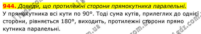 Доведи, що протилежні сторони прямокутника паралельні. У прямокутника всі кути по 90°. Тоді сума кутів, прилеглих до однієї сторони, рівняється 180°, виходить, протилежні сторони прямо кутника паралельні.