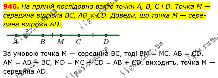 На прямій послідовно взято точки A, B, C і D. Точка M — середина відрізка BC, AB = CD. Доведи, що точка M — середина відрізка AD. За умовою точка M — середина BC, тоді BM = MC. AB = CD. AM = AB + BC, MD = MC + CD = AB + CD, виходить, точка M — середина AD.