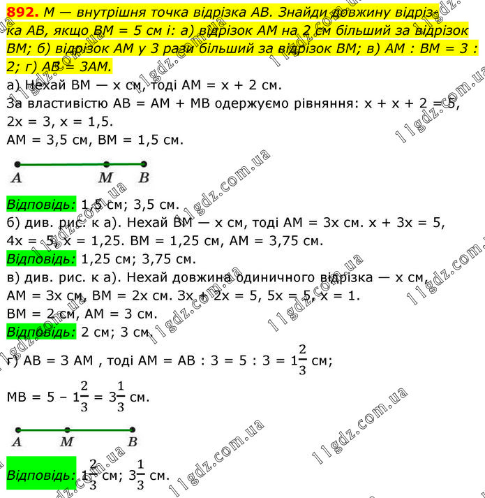 M — внутрішня точка відрізка AB. Знайди довжину відріз- ка AB, якщо BM = 5 см і: а) відрізок AM на 2 см більший за відрізок BM; б) відрізок AM у 3 рази більший за відрізок BM; в) AM : BM = 3 : 2; г) AB = 3AM. а) Нехай BM — х см, тоді AM = х + 2 см. За властивістю AB = AM + MB одержуємо рівняння: х + х + 2 = 5, 2х = 3, х = 1,5. AM = 3,5 см, BM = 1,5 см. Відповідь: 1,5 см; 3,5 см. б) див. рис. к а). Нехай BM — х см, тоді AM = 3х см. х + 3х = 5, 4х = 5, х = 1,25. BM = 1,25 см, AM = 3,75 см. Відповідь: 1,25 см; 3,75 см. в) див. рис. к а). Нехай довжина одиничного відрізка — х см, AM = Зх см, BM = 2х см. Зх + 2х = 5, 5х = 5, х = 1. BM = 2 см, AM = 3 см. Відповідь: 2 см; 3 см. г) AB = З AM , тоді AM = AB : 3 = 5 : 3 = 12/3 см; MB = 5 – 12/3 = 31/3 см. Відповідь: 12/3 см; 31/3 см.