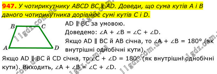 У чотирикутнику ABCD BC ∥ AD. Доведи, що сума кутів A і B даного чотирикутника дорівнює сумі кутів C і D. AD ∥ BC за умовою. Доведемо: ∠A + ∠B = ∠C + ∠D. Якщо AD ∥ BC й AB січна, то ∠A + ∠B = 180° (як внутрішні однобічні кути). Якщо AD ∥ BC й CD січна, то ∠C + ∠D = 180° (як внутрішні однобічні кути). Виходить, ∠A + ∠B = ∠C + ∠D.