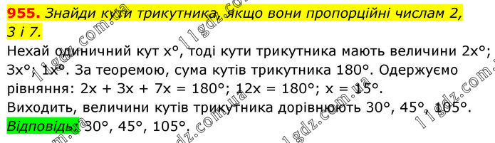 Знайди кути трикутника, якщо вони пропорційні числам 2, 3 і 7. Нехай одиничний кут х°, тоді кути трикутника мають величини 2x°; Зх°; 1х°. За теоремою, сума кутів трикутника 180°. Одержуємо рівняння: 2х + Зх + 7х = 180°; 12х = 180°; х = 15°. Виходить, величини кутів трикутника дорівнюють 30°, 45°, 105°. Відповідь: 30°, 45°, 105°.