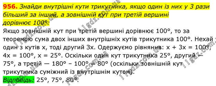 Знайди внутрішні кути трикутника, якщо один із них у 3 рази більший за інший, а зовнішній кут при третій вершині дорівнює 100°. Якщо зовнішній кут при третій вершині дорівнює 100°, то за теоремою сума двох інших внутрішніх кутів трикутника 100°. Нехай один з кутів х, тоді другий Зх. Одержуємо рівняння: х + 3х = 100°, 4х = 100°, х = 25°. Оскільки один кут трикутника 25°, другий — 75°, а третій — 180° – 100° = 80° (оскільки зовнішній кут трикутника суміжний із внутрішнім кутом). Відповідь: 25°, 75°, 80°.
