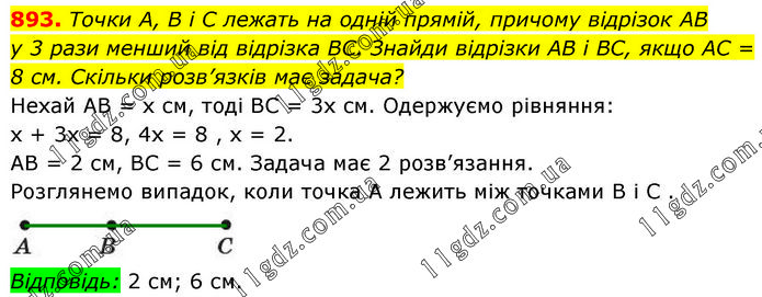 Точки A, B і C лежать на одній прямій, причому відрізок AB у 3 рази менший від відрізка BC. Знайди відрізки AB і BC, якщо AC = 8 см. Скільки розв’язків має задача? Нехай АВ = х см, тоді BC = 3х см. Одержуємо рівняння: х + 3х = 8, 4х = 8 , х = 2. AB = 2 см, BC = 6 см. Задача має 2 розв’язання. Розглянемо випадок, коли точка А лежить між точками В i C . Відповідь: 2 см; 6 см.