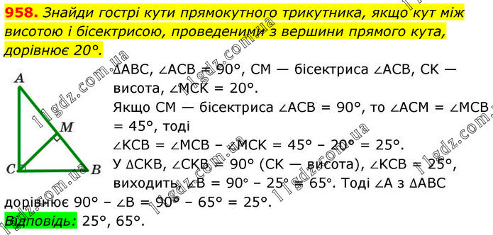 Знайди гострі кути прямокутного трикутника, якщо кут між висотою і бісектрисою, проведеними з вершини прямого кута, дорівнює 20°. ∆ABC, ∠ACB = 90°, CM — бісектриса ∠ACB, CK — висота, ∠MCK = 20°. Якщо CM — бісектриса ∠ACB = 90°, то ∠ACM = ∠MCB = 45°, тоді ∠KCB = ∠MCB – ∠MCK = 45° – 20° = 25°. У ∆CKB, ∠CKB = 90° (CK — висота), ∠KCB = 25°, виходить, ∠B = 90° – 25° = 65°. Тоді ∠A з ∆ABC дорівнює 90° – ∠B = 90° – 65° = 25°. Відповідь: 25°, 65°.