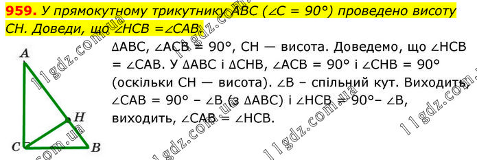 У прямокутному трикутнику ABC (∠C = 90°) проведено висоту CH. Доведи, що ∠HCB =∠CAB. ∆ABC, ∠ACB = 90°, CH — висота. Доведемо, що ∠HCB = ∠CAB. У ∆ABC і ∆CHB, ∠ACB = 90° і ∠CHB = 90° (оскільки CH — висота). ∠B – спільний кут. Виходить, ∠CAB = 90° – ∠B (з ∆АВС) і ∠HCB = 90°– ∠B, виходить, ∠CAB = ∠HCB.