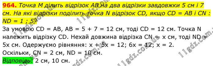 Точка M ділить відрізок AB на два відрізки завдовжки 5 см і 7 см. На які відрізки поділить точка N відрізок CD, якщо CD = AB і CN : ND = 1 : 5? За умовою CD = AB, AB = 5 + 7 = 12 см, тоді CD = 12 см. Точка N належить відрізку CD. Нехай довжина відрізка CN — х см, тоді ND = 5х см. Одержуємо рівняння: х + 5х = 12; 6х = 12; х = 2. Оскільки, CN = 2 см, ND = 10 см. Відповідь: 2 см, 10 см.