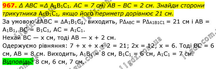 ∆ABC = ∆А1В1С1. AC = 7 см, AB – BC = 2 см. Знайди сторони трикутника А1В1С1, якщо його периметр дорівнює 21 см. За умовою ∆ABC = ∆А1В1С1, виходить, P∆АВС = Р∆А1В1С1 = 21 см і AB = А1В1, BC = В1С1, AC = А1С1. Нехай BC — х см, тоді AB — х + 2 см. Одержуємо рівняння: 7 + х + х + 2 = 21; 2х = 12; х = 6. Тоді BC = 6 см, AB = 8 см. Виходить, A1B1 = 8 см, B1C1 = 6 см, A1C1 = 7 см. Відповідь: 8 см, 6 см, 7 см.