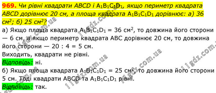 Чи рівні квадрати ABCD і А1В1С1D1, якщо периметр квадрата ABCD дорівнює 20 см, а площа квадрата А1В1С1D1 дорівнює: а) 36 см2; б) 25 см2? а) Якщо площа квадрата А1В1С1D1 = 36 см2, то довжина його сторони — 6 см, а якщо периметр квадрата ABC дорівнює 20 см, то довжина його сторони — 20 : 4 = 5 см. Виходить, квадрати не рівні. Відповідь: ні. б) Якщо площа квадрата A1В1C1D1 = 25 см2, то довжина його сторони 5 см. Тоді квадрати ABCD та A1В1C1D1 рівні. Відповідь: так.