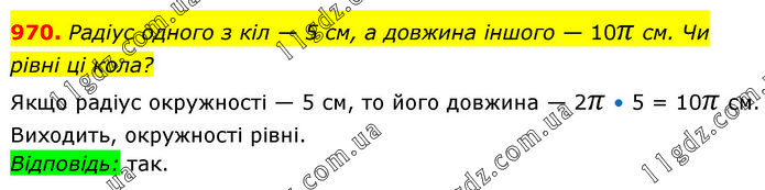 Радіус одного з кіл — 5 см, а довжина іншого — 10π см. Чи рівні ці кола? Якщо радіус окружності — 5 см, то його довжина — 2π • 5 = 10π см. Виходить, окружності рівні. Відповідь: так.