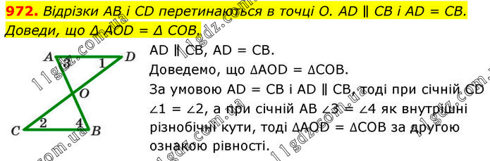 Відрізки AB і CD перетинаються в точці O. AD ∥ CB і AD = CB. Доведи, що ∆AOD = ∆COB. AD ∥ CB, AD = CB. Доведемо, що ∆AOD = ∆СОВ. За умовою AD = CB і AD ∥ CB, тоді при січній CD ∠1 = ∠2, а при січній AB ∠3 = ∠4 як внутрішні різнобічні кути, тоді ∆AOD = ∆СОВ за другою ознакою рівності.