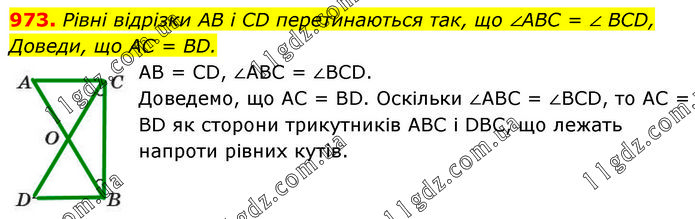 Рівні відрізки AB і CD перетинаються так, що ∠ABC = ∠ BCD, Доведи, що AC = BD. AB = CD, ∠ABC = ∠BCD. Доведемо, що AC = BD. Оскільки ∠ABC = ∠BCD, то AC = BD як сторони трикутників ABC і DBC, що лежать напроти рівних кутів.