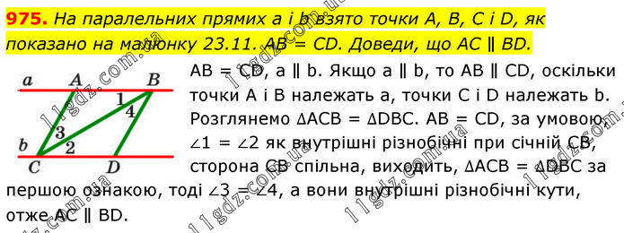 На паралельних прямих a і b взято точки A, B, C і D, як показано на малюнку 23.11. AB = CD. Доведи, що AC ∥ BD. AB = CD, а ∥ b. Якщо а ∥ b, то AB ∥ CD, оскільки точки A i B належать а, точки C i D належать b. Розглянемо ∆ACB = ∆DBC. AB = CD, за умовою, ∠1 = ∠2 як внутрішні різнобічні при січній CB, сторона CB спільна, виходить, ∆ACB = ∆DBC за першою ознакою, тоді ∠3 = ∠4, а вони внутрішні різнобічні кути, отже AC ∥ BD.