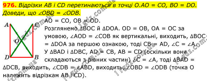 Відрізки AB і CD перетинаються в точці O. AO = CO, BO = DO. Доведи, що ∠OBD = ∠ODB. AO = CO, OB = OD. Розглянемо ∆BOC й ∆DOA. OD = OB, OA = OC за умовою, ∠AOD = ∠COB як вертикальні, виходить, ∆BOC = ∆DOA за першою ознакою, тоді CB = AD, ∠C = ∠A. У ∆BAD і ∆DBC, AD = CB, AB = CD (оскільки вони складаються з рівних частин) ∠C = ∠A, тоді ∆BAD = ∆DCB, виходить, ∠CDB = ∠ABD, виходить, ∠OBD = ∠ODB (точка O належить відрізкам AB і CD).