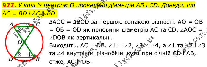 У колі із центром O проведено діаметри AB і CD. Доведи, що AC = BD і AC ∥ BD. ∆AOC = ∆BOD за першою ознакою рівності. AO = OB = OB = OD як половини діаметрів AC та CD, ∠AOC = ∠DOB як вертикальні. Виходить, AC = DB. ∠1 = ∠2, ∠3 = ∠4, a ∠1 та ∠2 і ∠3 та ∠4 внутрішні різнобічні кути при січній CD і AB, отже, AC ∥ DB.