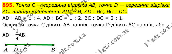 Точка C — середина відрізка AB, точка D — середина відрізка AC. Знайди відношення AD : AB, AD : BC, BC : DC. AD : AB = 1 : 4. AD : BC = 1 : 2. BC : DC = 2 : 1. Оскільки точка C ділить AB навпіл, точка D ділить AC навпіл, або AD – 1/4АВ.
