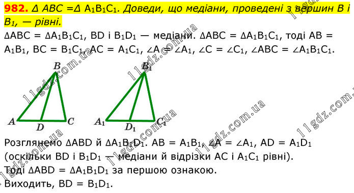 ∆ABC = ∆A1B1C1. Доведи, що медіани, проведені з вершин B і B1, — рівні. ∆ABC = ∆A1B1C1, BD і B1D1 — медіани. ∆ABC = ∆A1B1C1, тоді AB = A1B1, BC = B1C1, AC = A1C1, ∠A = ∠A1, ∠C = ∠C1, ∠ABC = ∠A1B1C1. Розглянемо ∆ABD й ∆A1B1D1. AB = A1B1, ∠A = ∠A1, AD = A1D1 (оскільки BD і B1D1 — медіани й відрізки AC і A1C1 рівні). Тоді ∆ABD = ∆A1B1D1 за першою ознакою. Виходить, BD = B1D1.
