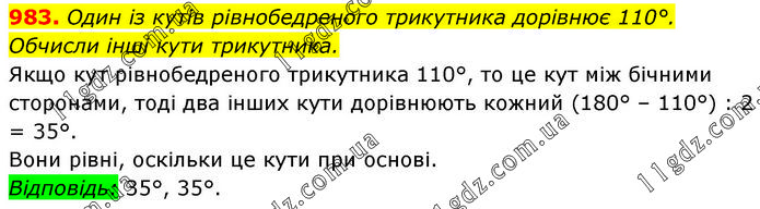 Один із кутів рівнобедреного трикутника дорівнює 110°. Обчисли інші кути трикутника. Якщо кут рівнобедреного трикутника 110°, то це кут між бічними сторонами, тоді два інших кути дорівнюють кожний (180° – 110°) : 2 = 35°. Вони рівні, оскільки це кути при основі. Відповідь: 35°, 35°.