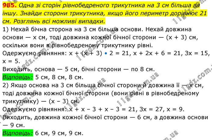 Одна зі сторін рівнобедреного трикутника на 3 см більша за іншу. Знайди сторони трикутника, якщо його периметр дорівнює 21 см. Розглянь всі можливі випадки. 1) Нехай бічна сторона на 3 см більша основи. Нехай довжина основи — х см, тоді довжина кожної бічної сторони — (х + 3) см, оскільки вони в рівнобедреному трикутнику рівні. Одержуємо рівняння: х + (х + 3) • 2 = 21, х + 2х + 6 = 21, Зх = 15, х = 5. Виходить, основа — 5 см, бічні сторони — по 8 см. Відповідь: 5 см, 8 см, 8 см. 2) Якщо основа на 3 см більша бічної сторони й довжина її — х см, тоді довжина кожної бічної сторони (вони рівні в рівнобедреному трикутнику) — (х – 3) см. Одержуємо рівняння: х + х – 3 + х – 3 = 21, Зх = 27, х = 9. Виходить, довжина кожної бічної сторони — 6 см, а довжина основи — 9 см. Відповідь: 6 см, 9 см, 9 см.