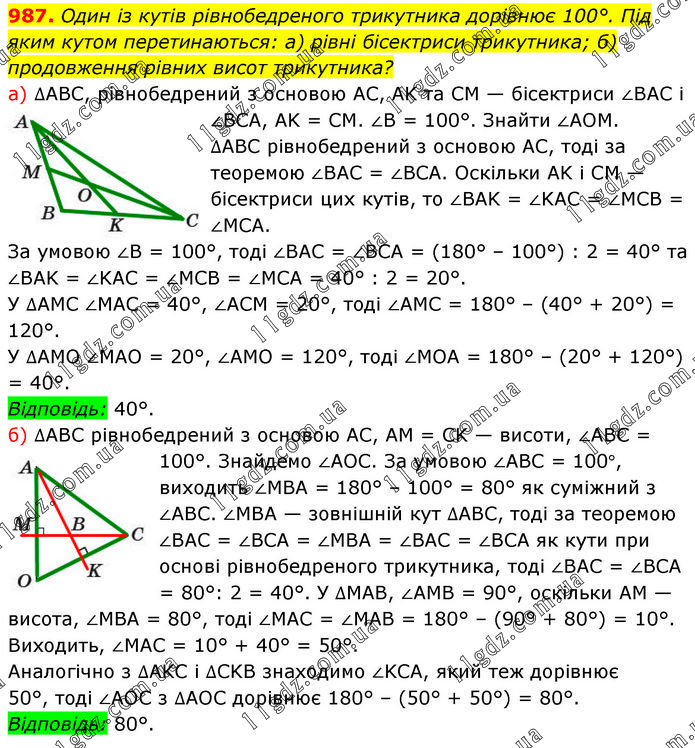 Один із кутів рівнобедреного трикутника дорівнює 100°. Під яким кутом перетинаються: а) рівні бісектриси трикутника; б) продовження рівних висот трикутника? а) ∆ABC, рівнобедрений з основою AC, AK та CM — бісектриси ∠BAC і ∠BCA, AK = CM. ∠B = 100°. Знайти ∠AOM. ∆ABC рівнобедрений з основою AC, тоді за теоремою ∠ВАС = ∠BCA. Оскільки AK і CM — бісектриси цих кутів, то ∠BAK = ∠KAC = ∠MCB = ∠MCA. За умовою ∠B = 100°, тоді ∠BAC = ∠BCA = (180° – 100°) : 2 = 40° та ∠BAK = ∠KAC = ∠MCB = ∠MCA = 40° : 2 = 20°. У ∆AMC ∠MAC = 40°, ∠ACM = 20°, тоді ∠AMC = 180° – (40° + 20°) = 120°. У ∆AMO ∠MAO = 20°, ∠AМO = 120°, тоді ∠MOA = 180° – (20° + 120°) = 40°. Відповідь: 40°. б) ∆ABC рівнобедрений з основою AC, AM = CK — висоти, ∠ABC = 100°. Знайдемо ∠AOC. За умовою ∠ABC = 100°, виходить ∠MBA = 180° – 100° = 80° як суміжний з ∠ABC. ∠MBA — зовнішній кут ∆ABC, тоді за теоремою ∠ВАС = ∠BCA = ∠MBA = ∠ВАС = ∠BCA як кути при основі рівнобедреного трикутника, тоді ∠ВАС = ∠BCA = 80°: 2 = 40°. У ∆МАВ, ∠AMB = 90°, оскільки AM — висота, ∠MBA = 80°, тоді ∠МАС = ∠МАВ = 180° – (90° + 80°) = 10°. Виходить, ∠MAC = 10° + 40° = 50°. Аналогічно з ∆AKC і ∆CKB знаходимо ∠KCA, який теж дорівнює 50°, тоді ∠AOC з ∆АОС дорівнює 180° – (50° + 50°) = 80°. Відповідь: 80°.