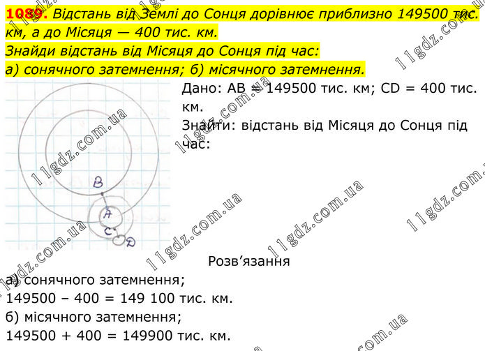 Відстань від Землі до Сонця дорівнює приблизно 149500 тис. км, а до Місяця — 400 тис. км. Знайди відстань від Місяця до Сонця під час: а) сонячного затемнення; б) місячного затемнення. Дано: АВ = 149500 тис. км; CD = 400 тис. км. Знайти: відстань від Місяця до Сонця під час: Розв’язання а) сонячного затемнення; 149500 – 400 = 149 100 тис. км. б) місячного затемнення; 149500 + 400 = 149900 тис. км.