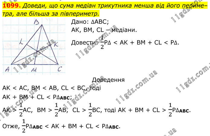 Доведи, що сума медіан трикутника менша від його периметра, але більша за півпериметр. Дано: ∆АВС; АК, ВМ, СL – медіани. Довести: 1/2Р∆ < AK + BM + CL < P∆. Доведення AK < AC, BM < AB, CL < BC, тоді AK + BM + CL < P∆ABC; AK > 1/2AC, BM > 1/2AB, CL > 1/2BC, тоді AK + BM + CL > 1/2P∆ABC. Отже, 1/2P∆ABC < AK + BM + CL < P∆ABC.