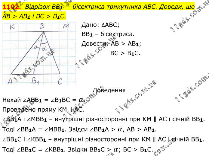 Відрізок BB1 — бісектриса трикутника ABC. Доведи, що AB > AB1 і BC > B1C. Дано: ∆АВС; ВВ1 – бісектриса. Довести: АВ > AB1; BC > B1C. Доведення Нехай ∠АВВ1 = ∠В1ВС = α. Проведемо пряму КМ ∥ АС. ∠ВВ1А і ∠МВВ1 – внутрішні різносторонні при КМ ∥ АС і січній ВВ1. Тоді ∠ВВ1А = ∠МВВ1. Звідси ∠ВВ1А > α, АВ > AB1. ∠ВВ1С і ∠КВВ1 – внутрішні різносторонні при КМ ∥ АС і січній ВВ1. Тоді ∠ВВ1С = ∠КВВ1. Звідки ВВ1С > α; BC > B1C.