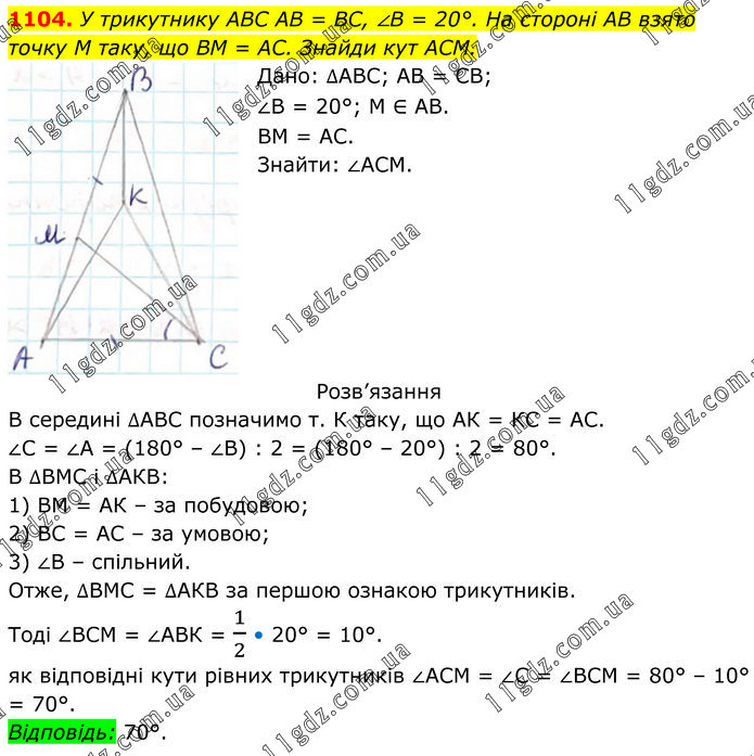 У трикутнику ABC AB = BC, ∠B = 20°. На стороні AB взято точку M таку, що BM = AC. Знайди кут ACM. Дано: ∆АВС; АВ = СВ; ∠В = 20°; М ∈ АВ. ВМ = АС. Знайти: ∠АСМ. Розв’язання В середині ∆АВС позначимо т. К таку, що АК = КС = АС. ∠С = ∠А = (180° – ∠В) : 2 = (180° – 20°) : 2 = 80°. В ∆ВМС і ∆АКВ: 1) ВМ = АК – за побудовою; 2) ВС = АС – за умовою; 3) ∠В – спільний. Отже, ∆ВМС = ∆АКВ за першою ознакою трикутників. Тоді ∠ВСМ = ∠АВК = 1/2 • 20° = 10°. як відповідні кути рівних трикутників ∠АСМ = ∠С = ∠ВСМ = 80° – 10° = 70°. Відповідь: 70°.