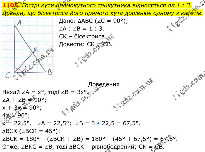 Гострі кути прямокутного трикутника відносяться як 1 : 3. Доведи, що бісектриса його прямого кута дорівнює одному з катетів. Дано: ∆АВС (∠С = 90°); ∠А : ∠В = 1 : 3. СК – бісектриса. Довести: СК = СВ. Доведення Нехай ∠А = х°, тоді ∠В = 3х°. ∠А + ∠В = 90°; х + 3х = 90°; 4х = 90°; х = 22,5°. ∠А = 22,5°; ∠В = 3 • 22,5 = 67,5°. ∆ВСК (∠ВСК = 45°): ∠ВСК = 180° – (∠ВСК + ∠В) = 180° – (45° + 67,5°) = 67,5°. Отже, ∠ВКС = ∠В, тоді ∆ВСК – рівнобедрений; СК = СВ.