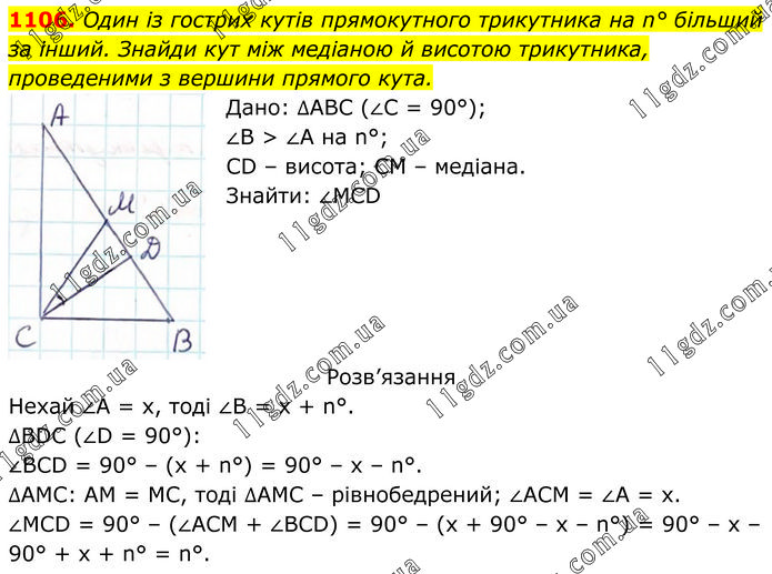 Один із гострих кутів прямокутного трикутника на n° більший за інший. Знайди кут між медіаною й висотою трикутника, проведеними з вершини прямого кута. Дано: ∆АВС (∠С = 90°); ∠В > ∠A на n°; CD – висота; СМ – медіана. Знайти: ∠MCD. Розв’язання Нехай ∠А = х, тоді ∠В = x + n°. ∆BDC (∠D = 90°): ∠BCD = 90° – (x + n°) = 90° – x – n°. ∆AMC: AM = MC, тоді ∆АМС – рівнобедрений; ∠АСМ = ∠А = х. ∠MCD = 90° – (∠ACM + ∠BCD) = 90° – (x + 90° – x – n°) = 90° – x – 90° + x + n° = n°.