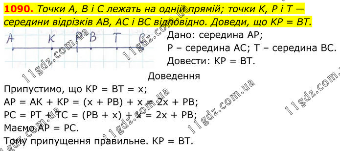 Точки A, B і C лежать на одній прямій; точки K, P і T — середини відрізків AB, AC і BC відповідно. Доведи, що KP = BT. Дано: середина АР; Р – середина АС; Т – середина ВС. Довести: КР = ВТ. Доведення Припустимо, що КР = ВТ = х; АР = АК + КР = (х + РВ) + х = 2х + РВ; РС = РТ + ТС = (РВ + х) + х = 2х + РВ. Маємо АР = РС. Тому припущення правильне. КР = ВТ.