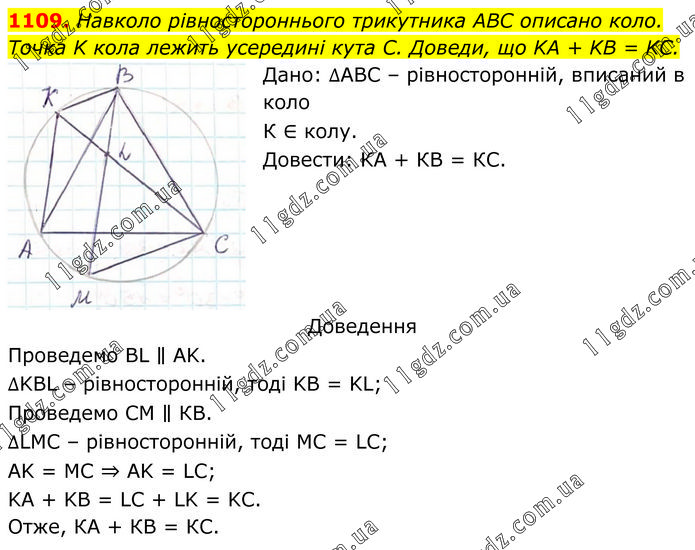 Навколо рівностороннього трикутника ABC описано коло. Точка K кола лежить усередині кута C. Доведи, що KA + KB = KC. Дано: ∆АВС – рівносторонній, вписаний в коло К ∈ колу. Довести: КА + КВ = КС. Доведення Проведемо BL ∥ AK. ∆KBL – рівносторонній, тоді KB = KL. Проведемо СМ ∥ КВ. ∆LMC – рівносторонній, тоді MC = LC; AK = MC ⇒ AK = LC; KA + KB = LC + LK = KC. Отже, КА + КВ = КС.