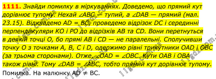 Знайди помилку в міркуваннях. Доведемо, що прямий кут дорівнює тупому. Нехай ∠ABC — тупий, а ∠DAB — прямий (мал. 23.15). Відкладемо AD = BC, проведемо відрізок DC і серединні перпендикуляри KO і PO до відрізків AB та CD. Вони перетнуться в деякій точці O, бо прямі AB і CD — не паралельні. Сполучивши точку O з точками A, B, C і D, одержимо рівні трикутники OAD і OBC (за трьома сторонами). Отже, ∠OAD = ∠OBC. Кути OAB і OBA також рівні. Тому ∠DAB = ∠ABC, тобто прямий кут дорівнює тупому. Помилка. На малюнку AD ≠ BC.