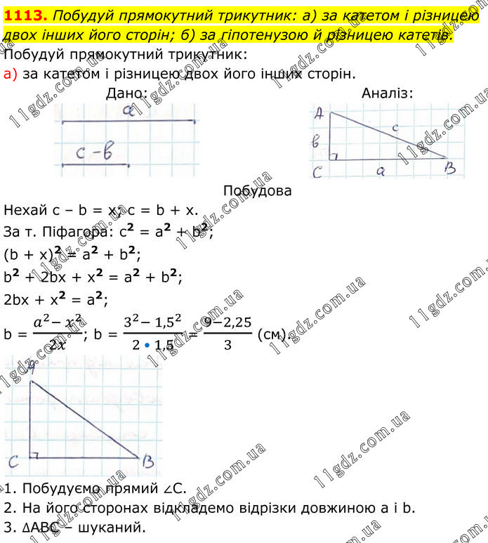 Побудуй прямокутний трикутник: а) за катетом і різницею двох інших його сторін; б) за гіпотенузою й різницею катетів. Побудуй прямокутний трикутник: а) за катетом і різницею двох його інших сторін. Дано: Аналіз: Побудова Нехай с – b = x; c = b + x. За т. Піфагора: c2 = a2 + b2; (b + x)2 = a2 + b2; b2 + 2bx + x2 = a2 + b2; 2bx + x2 = a2; b = (a^2- x^2)/2x; b = (3^2- 〖1,5〗^2)/(2 • 1,5) = (9-2,25)/3 (cм). 1. Побудуємо прямий ∠С. 2. На його сторонах відкладемо відрізки довжиною а і b. 3. ∆АВС – шуканий.