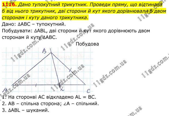 Дано тупокутний трикутник. Проведи пряму, що відтинала б від нього трикутник, дві сторони й кут якого дорівнювали б двом сторонам і куту даного трикутника. Дано: ∆АВС – тупокутний. Побудувати: ∆ABL, дві сторони й кут якого дорівнюють двом сторонам й куту ∆АВС. Побудова 1. На сторонві АС відкладемо AL = BC. 2. АВ – спільна сторона; ∠А – спільний. 3. ∆ABL – шуканий.