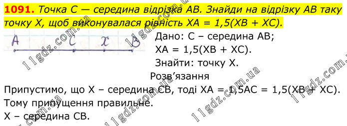 Точка C — середина відрізка AB. Знайди на відрізку AB таку точку X, щоб виконувалася рівність XA = 1,5(XB + XC). Дано: С – середина АВ; ХА = 1,5(ХВ + ХС). Знайти: точку Х. Розв’язання Припустимо, що Х – середина СВ, тоді ХА = 1,5АС = 1,5(ХВ + ХС). Тому припущення правильне. Х – середина СВ.