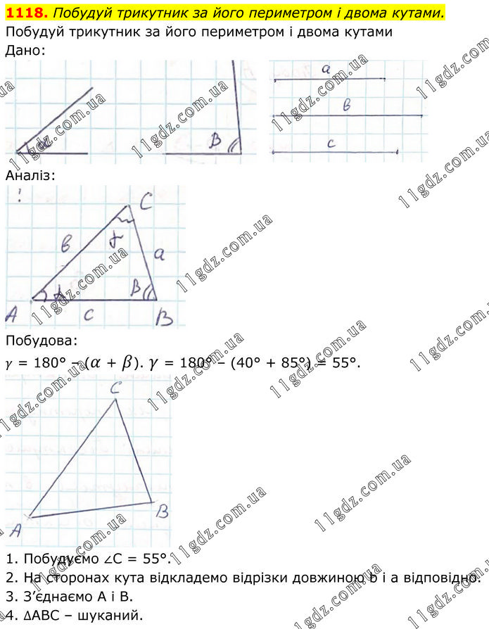 Побудуй трикутник за його периметром і двома кутами. Побудуй трикутник за його периметром і двома кутами Дано: Аналіз: Побудова: γ = 180° – (α + β). γ = 180° – (40° + 85°) = 55°. 1. Побудуємо ∠С = 55°. 2. На сторонах кута відкладемо відрізки довжиною b i a відповідно. 3. З’єднаємо А і В. 4. ∆АВС – шуканий.