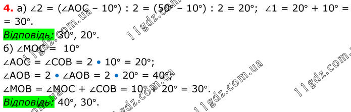 а) ∠2 = (∠АОС – 10°) : 2 = (50° – 10°) : 2 = 20°; ∠1 = 20° + 10° = = 30°. Відповідь: 30°, 20°. б) ∠МОС = 10° ∠АОС = ∠СОВ = 2 • 10° = 20°; ∠АОВ = 2 • ∠АОВ = 2 • 20° = 40°; ∠МОВ = ∠МОС + ∠СОВ = 10° + 20° = 30°. Відповідь: 40°, 30°.