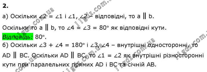 а) Оскільки ∠2 = ∠1 і ∠1, ∠2 – відповідні, то а ∥ b. Оскільки то а ∥ b, то ∠4 = ∠3 = 80° як відповідні кути. Відповідь: 80°. б) Оскільки ∠3 + ∠4 = 180° і ∠3, ∠4 – внутрішні односторонні, то AD ∥ BC. Оскільки AD ∥ BC, то ∠1 = ∠2 як внутрішні різносторонні кути при паралельних прямих AD і ВС та січній АВ.