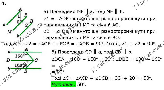 а) Проведемо MF ∥ a, тоді MF ∥ b. ∠1 = ∠AOF як внутрішні різносторонні кути при паралельних а і MF та січній АО. ∠2 = ∠FOB як внутрішні різносторонні кути при паралельних b і MF та січній ВО. Тоді ∠1 + ∠2 = ∠AOF + ∠FOB = ∠AOB = 90°. Отже, ∠1 + ∠2 = 90°. б) Проведемо CD ∥ a, тоді CD ∥ b. ∠DCA = 180° – 150° = 30°; ∠DBC = 180° – 160° = = 20°. Тоді ∠С = ∠ACD + ∠DCB = 30° + 20° = 50°. Відповідь: 50°.