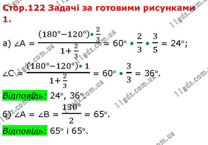 Стор.122 Задачі за готовими рисунками 1. а) ∠А = ((180°-120°)• 2/3)/(1+ 2/3) = 60° • 2/3 • 3/5 = 24°; ∠С = ((180°-120°)• 1)/(1+ 2/3) = 60° • 3/3 = 36°. Відповідь: 24°, 36°. б) ∠А = ∠В = (130°)/2 = 65°. Відповідь: 65° і 65°.
