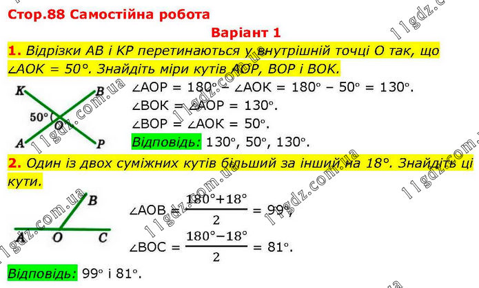 Варіант 1 1. Відрізки AB і KP перетинаються у внутрішній точці O так, що ∠AOK = 50°. Знайдіть міри кутів AOP, BOP і BOK. ∠АОР = 180° – ∠АОК = 180° – 50° = 130°. ∠ВОК = ∠АОР = 130°. ∠ВОР = ∠АОК = 50°. Відповідь: 130°, 50°, 130°. 2. Один із двох суміжних кутів більший за інший на 18°. Знайдіть ці кути. ∠АОВ = (180°+18°)/2 = 99°, ∠ВОС = (180°-18°)/2 = 81°. Відповідь: 99° і 81°.