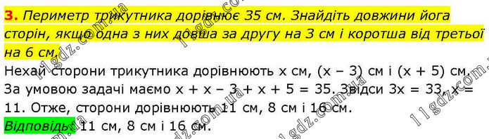 Периметр трикутника дорівнює З5 см. Знайдіть довжини йога сторін, якщо одна з них довша за другу на З см і коротша від третьої на 6 см. Нехай сторони трикутника дорівнюють х см, (х – 3) см і (х + 5) см. За умовою задачі маємо х + х – 3 + х + 5 = 35. Звідси 3х = 33, х = 11. Отже, сторони дорівнюють 11 см, 8 см і 16 см. Відповідь: 11 см, 8 см і 16 см.