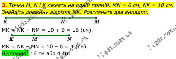 Точки М, N i K лежать на одній прямій. MN = 6 см, NK = 10 см. Знайдіть довжину відрізка MK. Розгляньте два випадки. МК = NK + NM = 10 + 6 = 16 (см). MK = NK – MN = 10 – 6 = 4 (см). Відповідь: 16 см або 4 см.